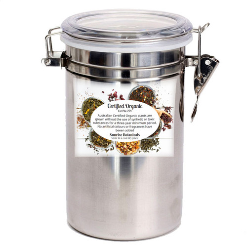 The attractive stainless-steel airtight canister has a see-through glass lid with a rubber seal and a clip-down steel clasp. Canister Size: 19.5cm [H] x 12.5cm [W]. Each boxed canister holds between 400g – 500g of loose-leaf tea.